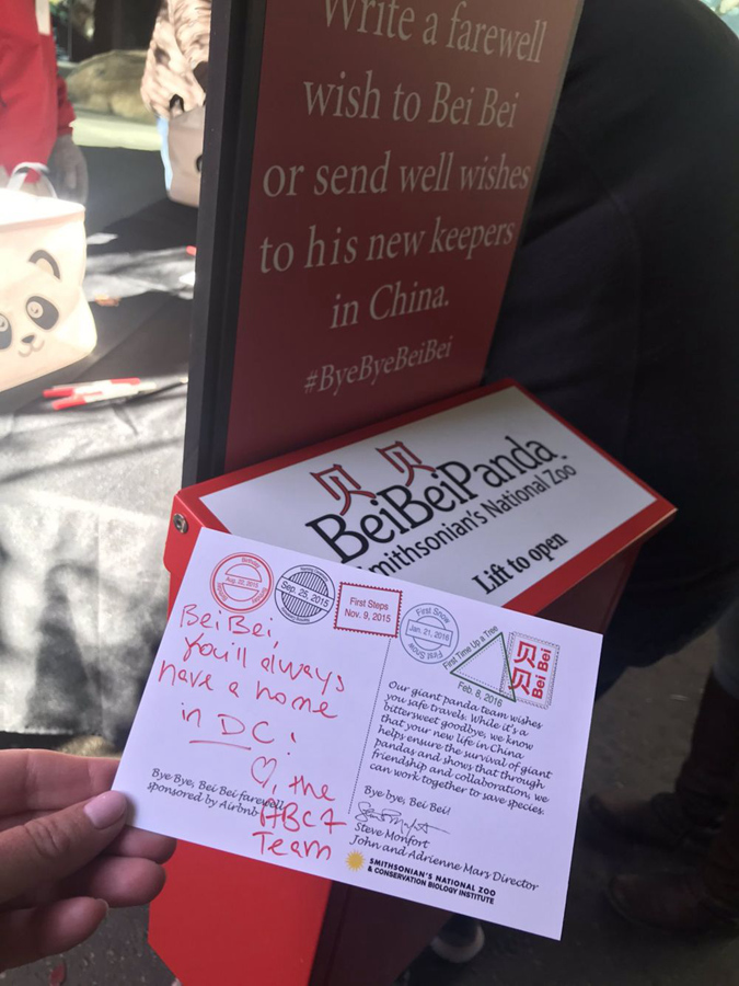 工作人員還在熊貓館外設立了一處臨時明信片中心。老老少少都在明信片上寫下給“貝貝”的祝福。據介紹,這些明信片也會一同送到中國。