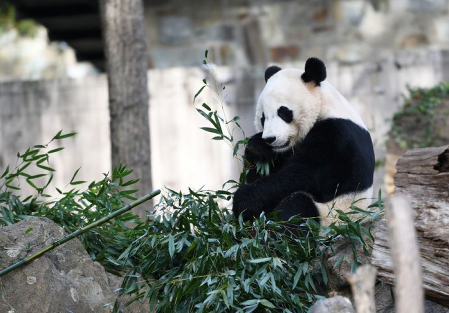 11月11日,“貝貝”在戶外吃竹葉。新華社記者劉杰攝