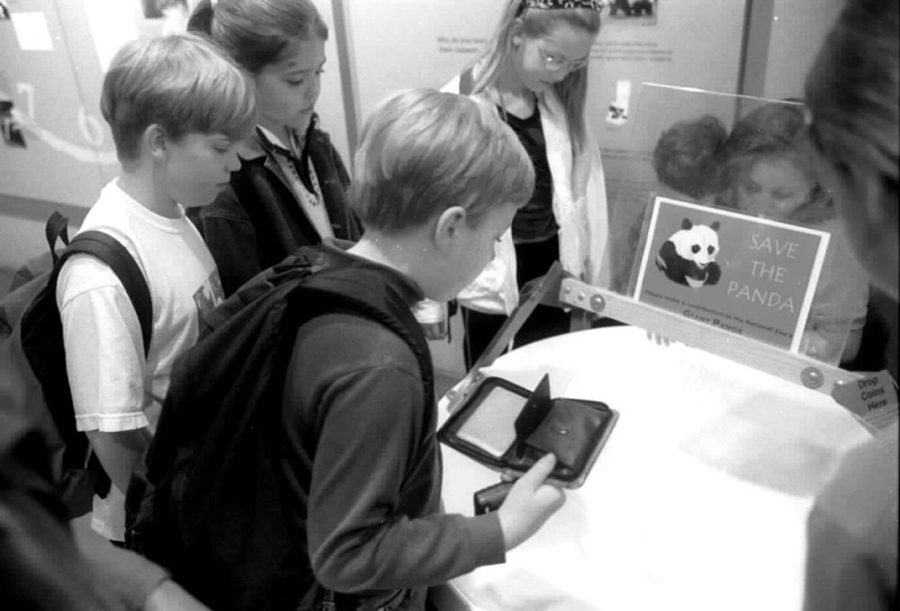 2000年5月21日,一些孩子在美國國家動物園大熊貓館內為拯救大熊貓基金會捐獻硬幣。新華社記者王巖攝(傳真照片)
