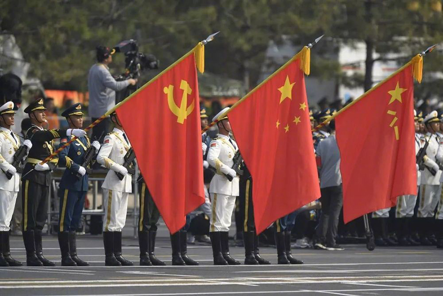 天安門廣場上,黨旗、國旗、軍旗迎風飄展。