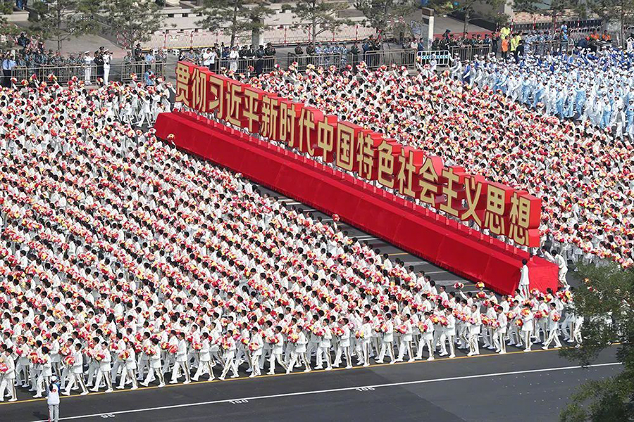 習近平總書記驅車行進至受閱部隊最前方,面向旗幟行注目禮。
