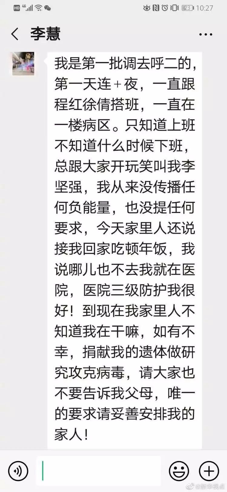 這些話,出自一名95后的小女孩之口,她是武漢科技大學天佑醫院腫瘤科的護士李慧。疫情爆發到現在,從除夕到初一,她堅守在工作崗位,從未離開。