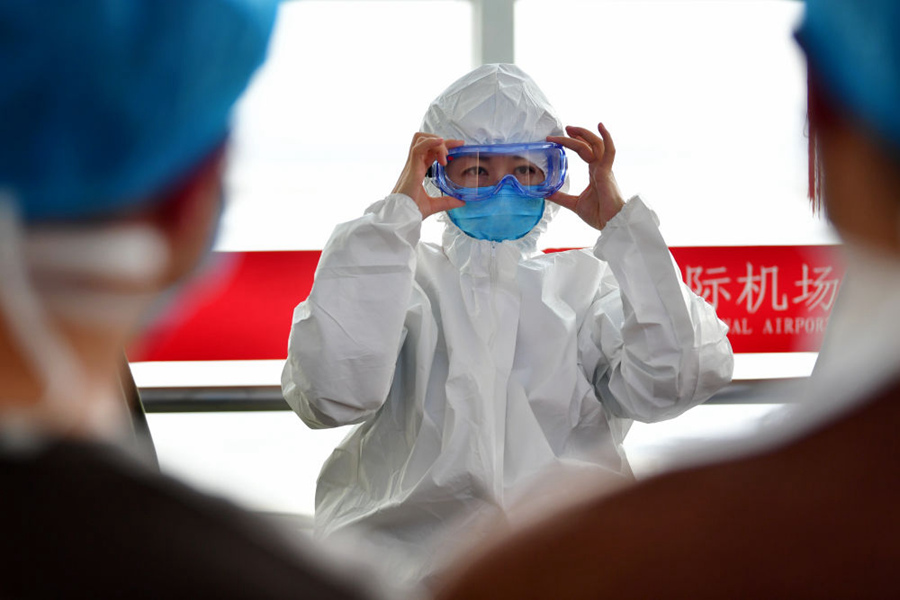 1月28日,甘肅中醫藥大學附屬醫院重癥醫學科護士長徐小艷(中)在出發前為同伴演示防護裝備穿戴。新華社記者 陳斌 攝