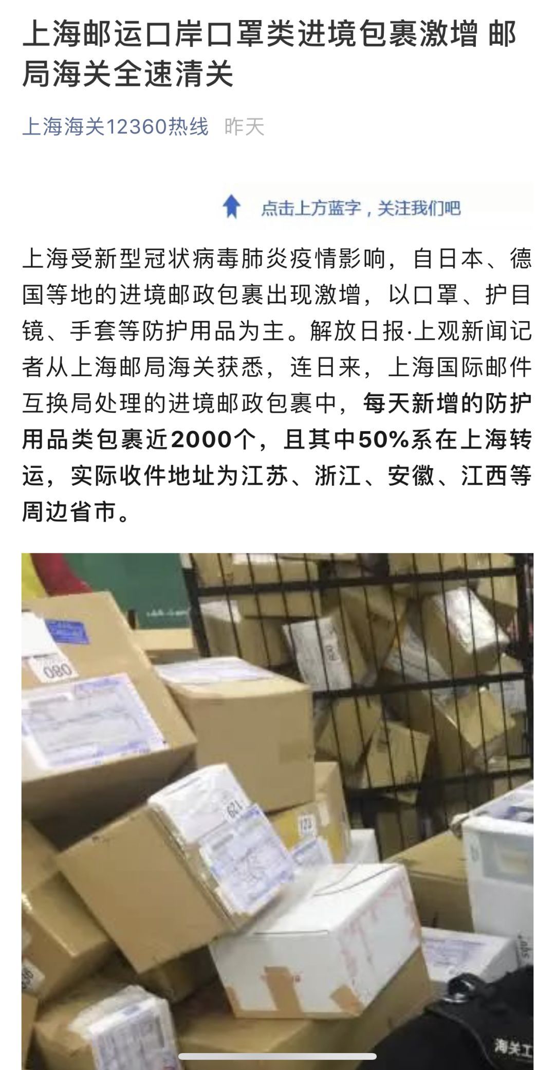 海關總署1月27日發出通知,對聲明涉及疫情物資的郵件快件,可以采取個案處理方式,優先辦理報關手續。為加速進出境郵件中口罩、護目鏡、手套等肺炎疫情防護用品的清關速度,上海郵局海關對外公布春節期間24小時聯系電話:021-56355716。相關防護用品郵件的寄收件人如有需求,可致電詳細報告郵件號碼,海關將即時進行快速驗放。
