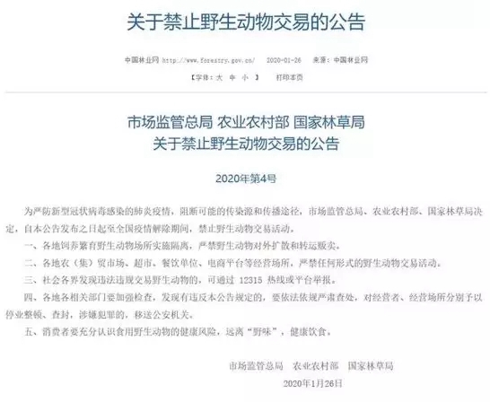 為此,國家市場監管總局、農業農村部、國家林業和草原局26日聯合發布公告要求,即日起至全國疫情解除期間,禁止野生動物交易活動,以斬斷病毒的傳染源和傳播途徑。