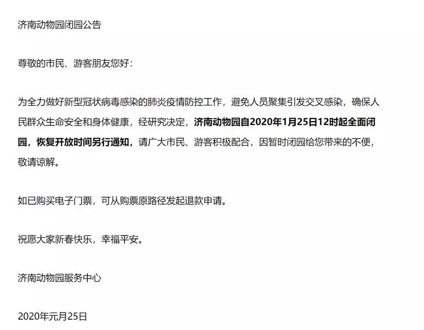 吉林、山東、湖北等地宣布叫停與野生動物相關一切交易和展演活動。陜西省林業局出臺十項措施,確保人與動物的安全距離。1月22日起,武漢市動物園、九峰森林動物園等景區都已經暫停對外開放。原本計劃春節不打烊的濟南野生動物世界,從1月25日12時起就宣布閉園。飼養員每天按照既定的消毒制度,對籠舍及舍外活動場進行消毒。