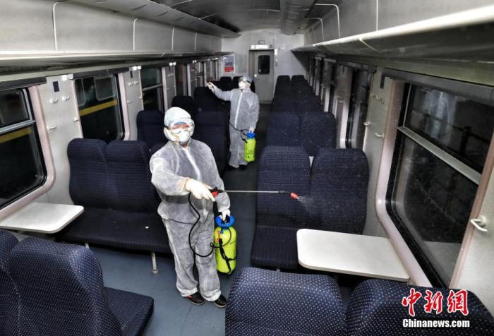 2月2日,中國鐵路烏魯木齊局集團有限公司疾控中心消殺科站車消殺隊對車體內對坐席噴灑消毒液。中新社發 擺風亮 攝