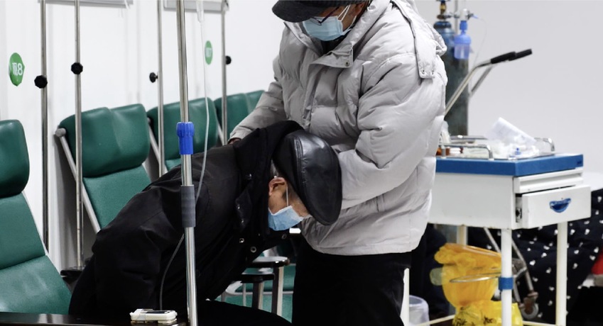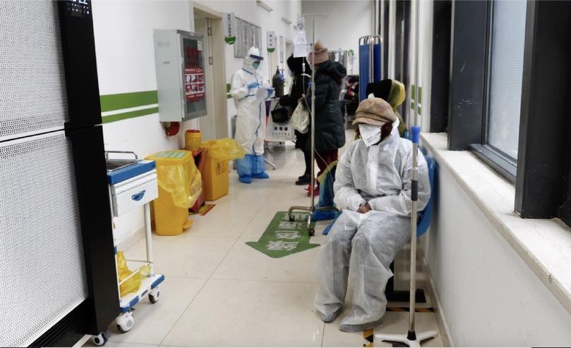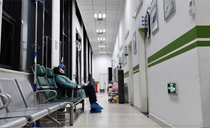 一個多小時過去,接近旁晚,仍有患者不斷進入發熱門診,走廊東邊坐著幾名老太太,戴著口罩靠在坐著上輸液,沒有交談。