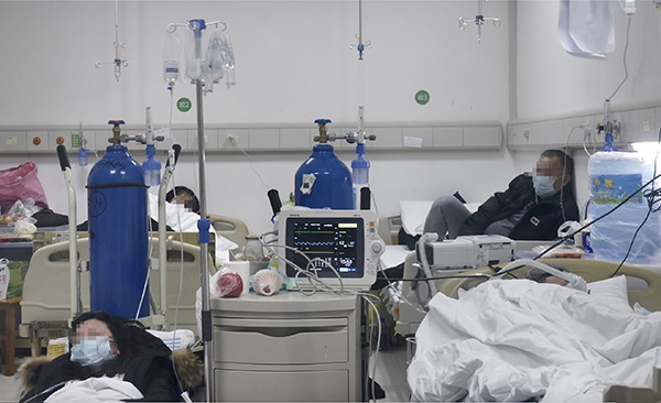 留觀室里的患者,幾乎每個人身邊立著一個近一人高的氧氣鋼瓶,更有病情嚴重者用上了呼吸機。他們大多數人坐在病床上,時而躺下,沒有交談。有的患者見到醫生時會哭泣;有的患者吸著氧,靜靜地發呆,眼睛沒有神。