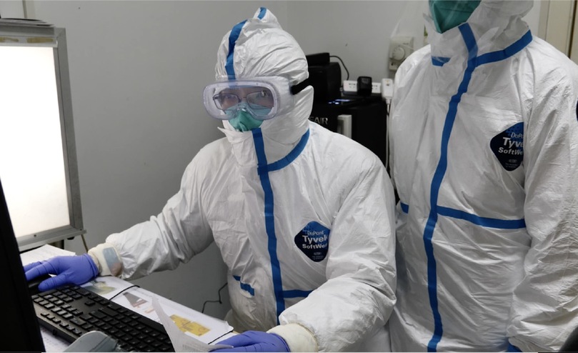 三層外科手套、一層頭套、一副面屏外加防護服,從醫護人員通道進入隔離通道,才進入工作區域。