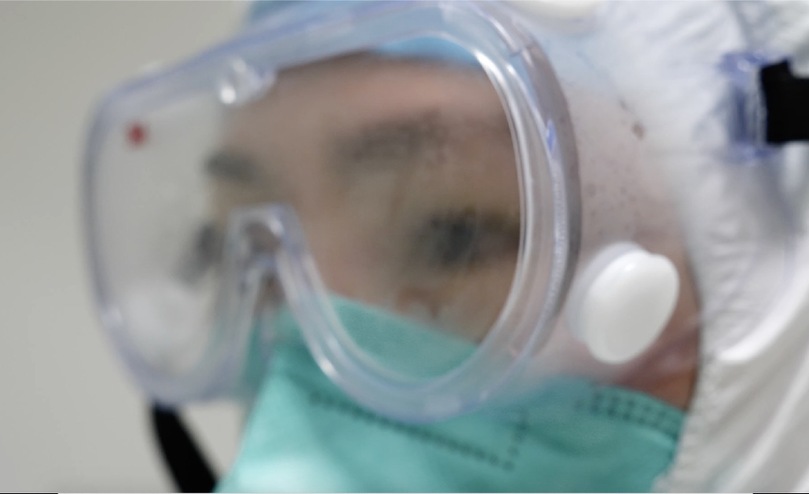 護士張潔與他人穿得有點不同,她在防護服外邊還套上一件一次性藍色手術服,但走起路來風風火火。