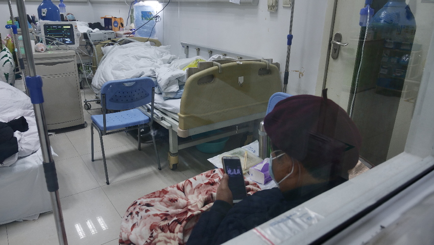 晚上十點鐘,發熱門診里僅能聽見護士的腳步聲,患者的咳嗽與喘氣聲。留觀室大多數病人已經入睡,但有一位戴著棗紅色帽子的老爺爺,他插著氧氣管仍坐著,捧著手機看電視劇。