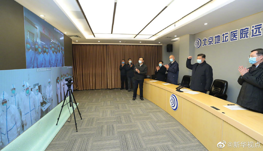10日下午,習近平來到北京地壇醫院,察看新冠肺炎感染者住院診療情況,視頻連線武漢市重癥患者收治醫院,聽取中央指導組、湖北指揮部有關情況匯報,慰問奮戰在一線的醫務工作者。隨后,習近平前往朝陽區疾病預防控制中心,了解朝陽區開展應急處置、流行病學調查、篩查報告和北京市疫情防控工作情況。(文字記者張曉松 攝影記者鞠鵬、謝環馳、劉彬)?