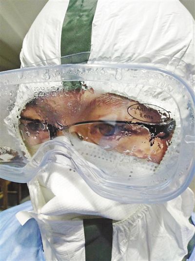 9日,國家緊急醫學救援隊(海南)隊員、海南醫學院第一附屬醫院醫生程少文承擔武漢國際會展中心方艙醫院的值班任務,不到兩小時護目鏡上的霧氣就形成了大片積水。國家緊急醫學救援隊(海南)供圖