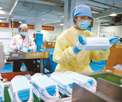 2月14日,在浙江長興縣和平鎮一家無紡布制品公司口罩生產車間,員工們在整理口罩。許 旭攝(人民視覺)