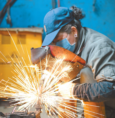 2月13日,江西瑞昌市一家公司的生產車間內,工人正在趕制負壓救護車沖壓配件。魏東升攝(影像中國)