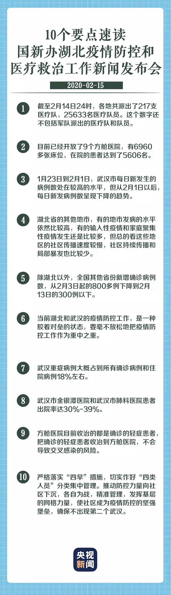 王賀勝:截至2月14日24時,各地共派出了217支醫療隊,25633名醫療隊員(不含軍隊派出的醫療隊和隊員),還調集了三個移動P3實驗室。其中在武漢市有181支醫療隊,20374名醫療隊員。在其他城市,有36支醫療隊,5259名醫療隊員,這些都大大超過了2008年汶川特大地震醫療救援的調動規模和速度。
