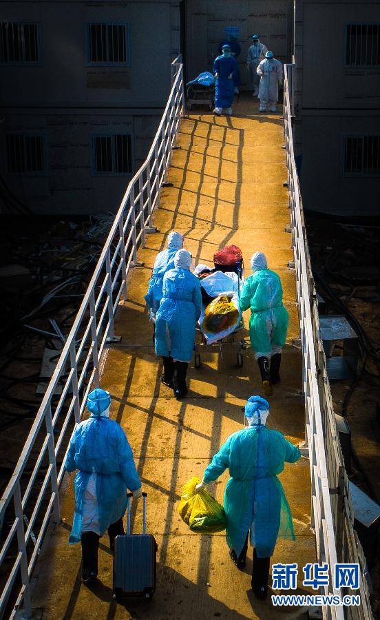 2月4日,醫護人員將患者轉運至武漢火神山醫院病房。 新華社記者 肖藝九 攝