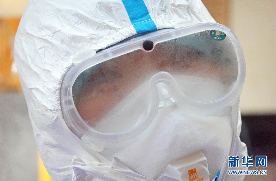 1月29日,北京宣武醫院一名醫護人員在武漢駐地練習防護技能時護目鏡內充滿霧氣。 新華社記者 才揚 攝