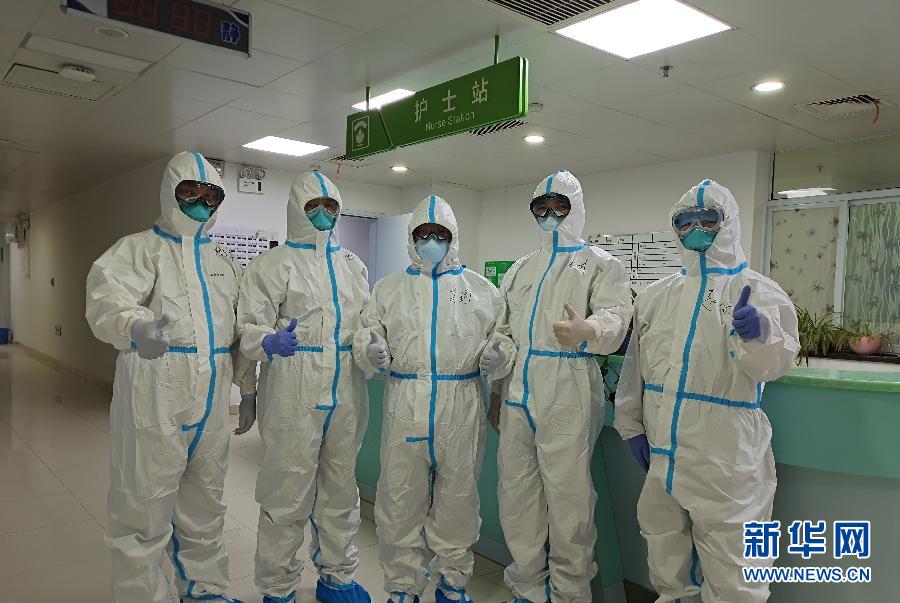 毛青(左二)和同事在金銀潭醫院一線病房工作時合影(1月26日攝)。 新華社發