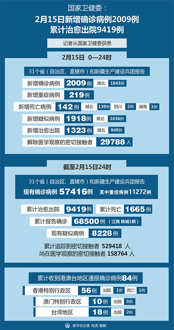 截至2月15日24時,據31個?。ㄗ灾螀^、直轄市)和新疆生產建設兵團報告,現有確診病例57416例(其中重癥病例11272例),累計治愈出院病例9419例,累計死亡病例1665例,累計報告確診病例68500例(江西省核減1例),現有疑似病例8228例。累計追蹤到密切接觸者529418人,尚在醫學觀察的密切接觸者158764人。