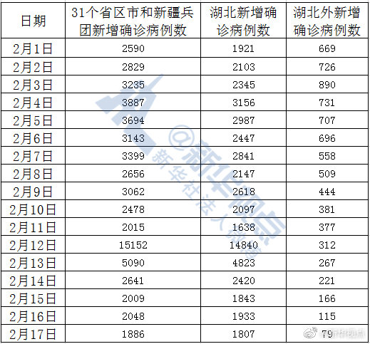 2月17日,31個?。ㄗ灾螀^、直轄市)和新疆生產建設兵團報告新增新冠肺炎確診病例1886例,湖北新增確診病例1807例。這就是說,除湖北外的30個省區市和新疆生產建設兵團昨日新增確診79例,這是自2月3日來新增病例到達高點890例以來的首次兩位數報告,也是第14連降。?