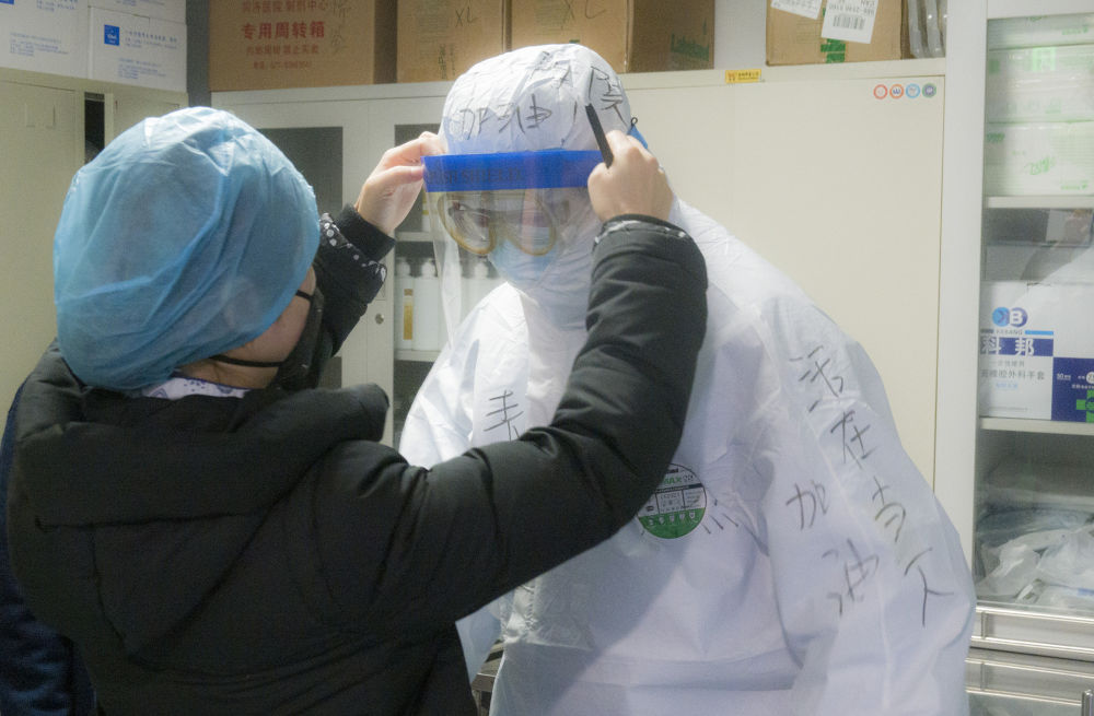 在武漢同濟醫院光谷院區,一名青島大學附屬醫院醫療隊醫護人員為同事佩戴面罩。