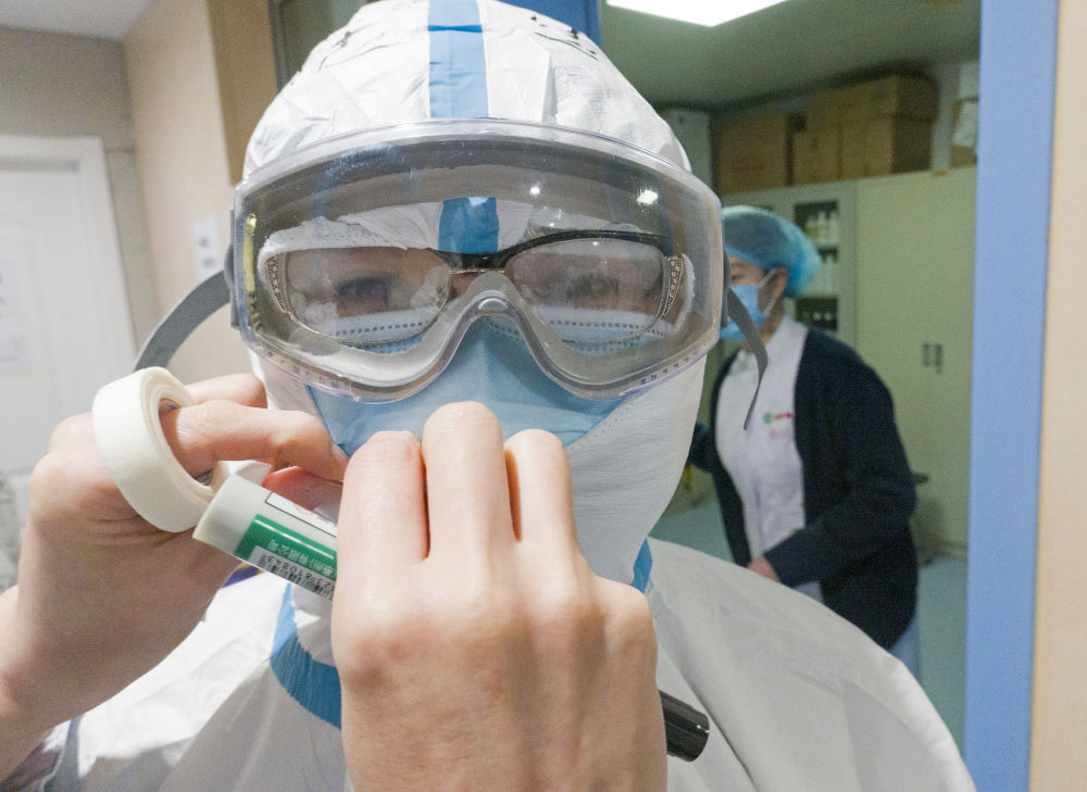 一名醫護人員戴好護目鏡后,用膠布再封一層增加氣密性。
