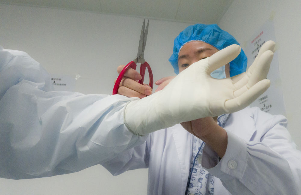 醫護人員為同事的手套貼上膠布增加氣密性能。