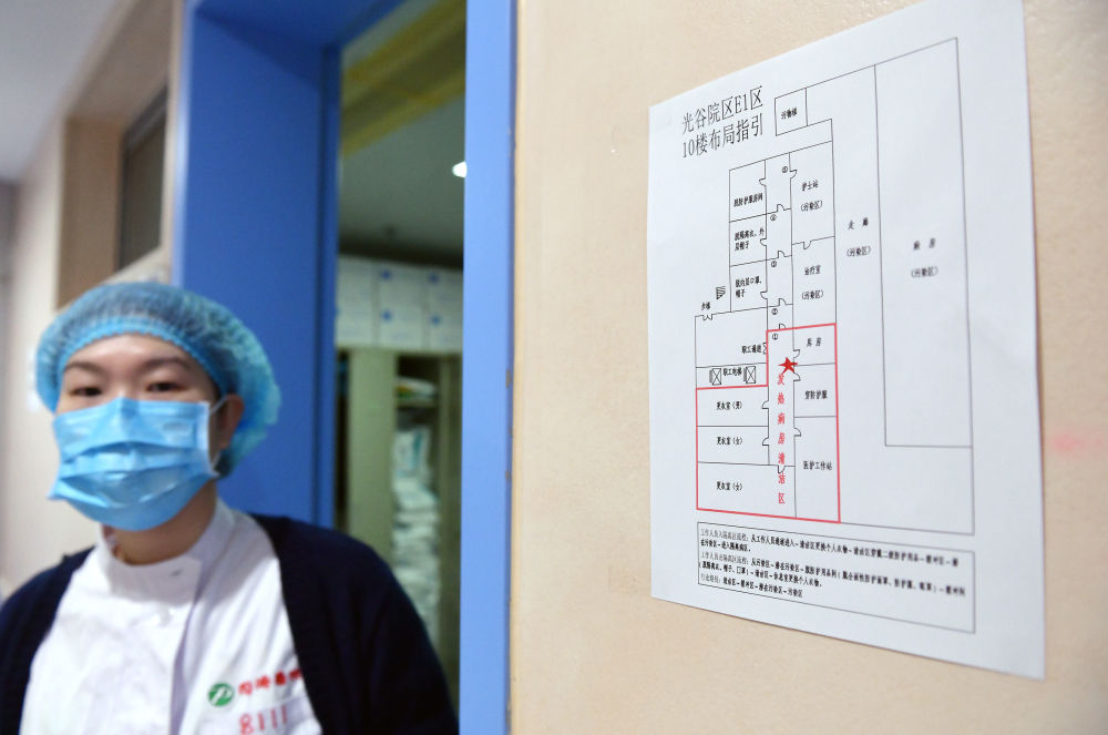 為醫務人員隨時了解情況,由青島大學附屬醫院醫療隊接管的武漢同濟醫院光谷院區工作間張貼著樓層布局指引。