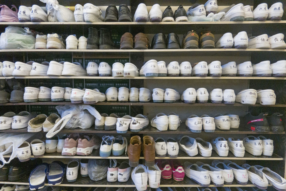 醫務人員按規定將鞋整齊有序地擺放在工作間外。