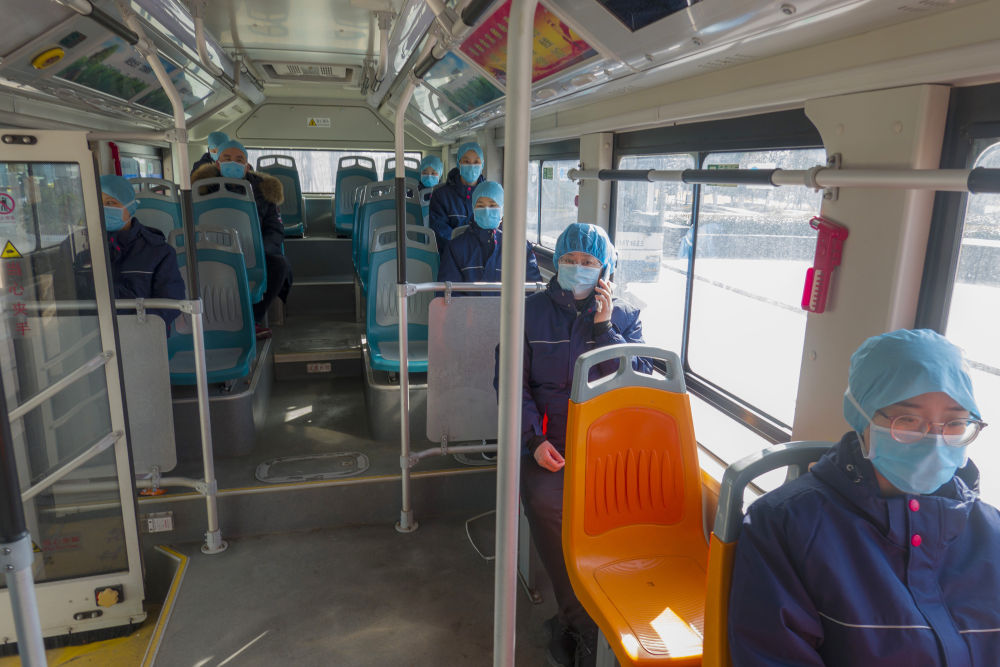 青島大學附屬醫院醫療隊醫護人員下班后乘大巴返回駐地,分散坐車,減少交叉感染風險。