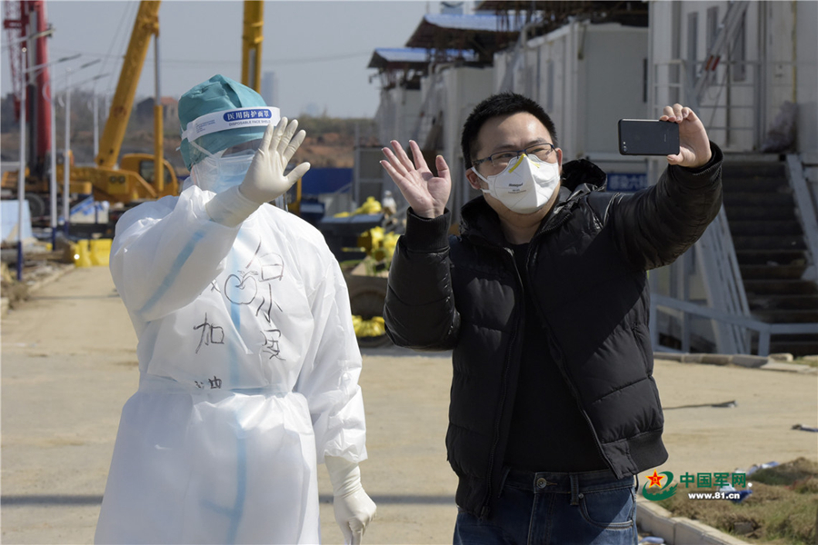 2月20日,治愈出院的萬先生錄制在火神山醫院的最后一條短視頻。中國軍網記者范顯海 攝