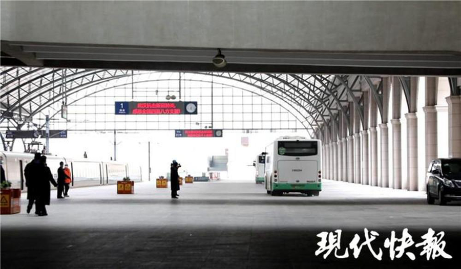 1 點 10 分,一列動車緩緩??吭谖錆h漢口火車站,醫療隊從車上搬下了二三十箱防護物資。