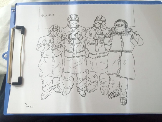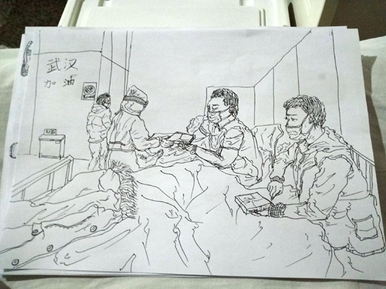 他把畫的“方艙生活”發到了微博上——兩位病人在床,護士俯身照顧。畫中醫院的墻上被他特意寫了四個字:“武漢加油?!保ǔ堂顺?/p>