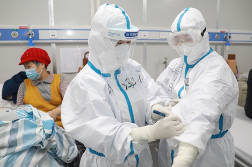 雷神山醫院內患者告訴護士飲食禁忌,由于沒有紙護士就記錄在衣服上