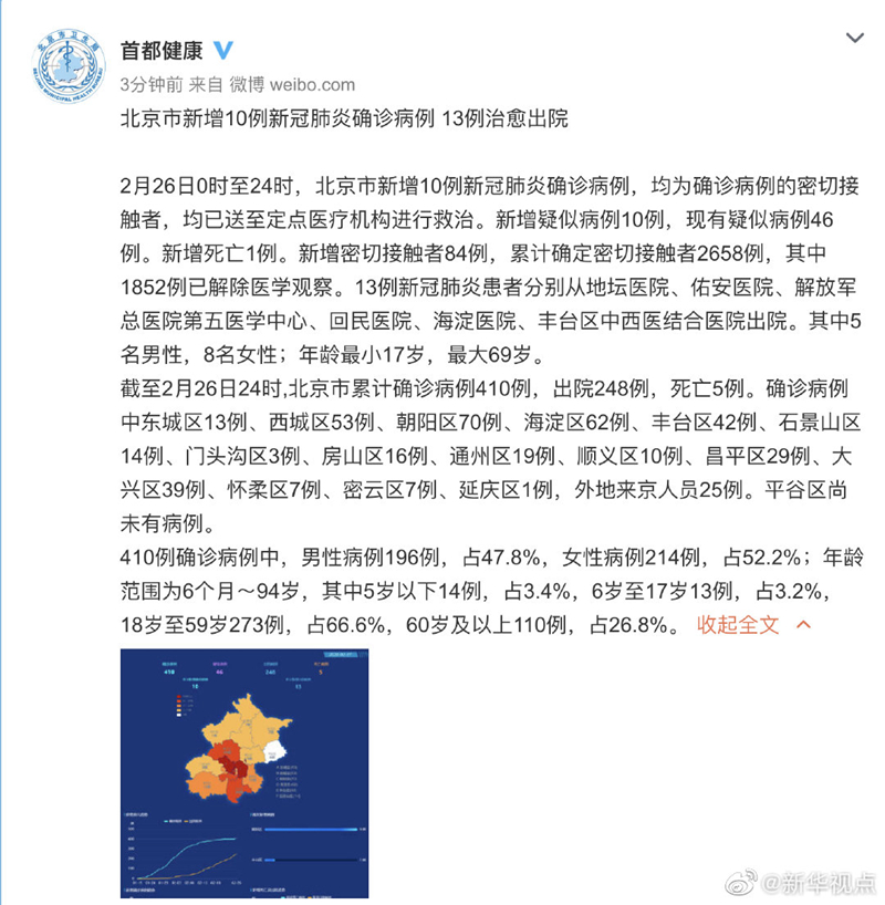 截至2月26日24時,北京市累計確診病例410例,出院248例,死亡5例。確診病例中東城區13例、西城區53例、朝陽區70例、海淀區62例、豐臺區42例、石景山區14例、門頭溝區3例、房山區16例、通州區19例、順義區10例、昌平區29例、大興區39例、懷柔區7例、密云區7例、延慶區1例,外地來京人員25例。平谷區尚未有病例。