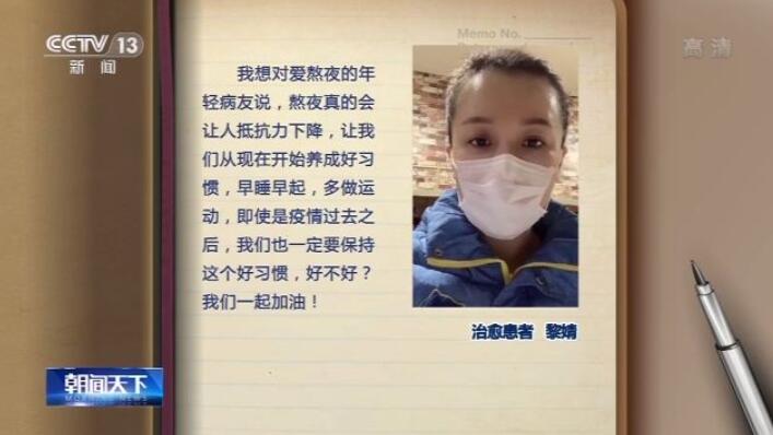 我想對愛熬夜的年輕病友說,熬夜真的會讓人抵抗力下降,讓我們從現在開始養成好習慣,早睡早起,多做運動,即使是疫情過去之后,我們也一定要保持這個好習慣,好不好?我們一起加油! ——治愈患者黎婧