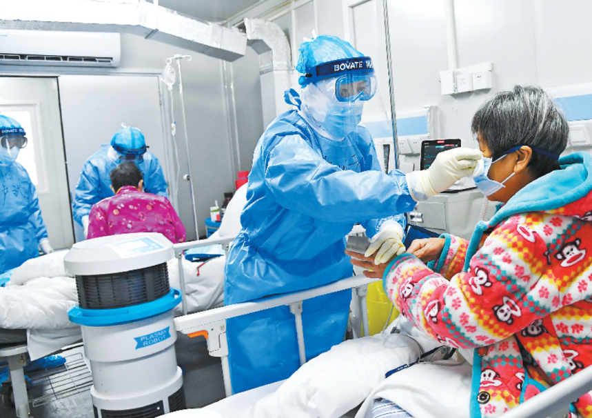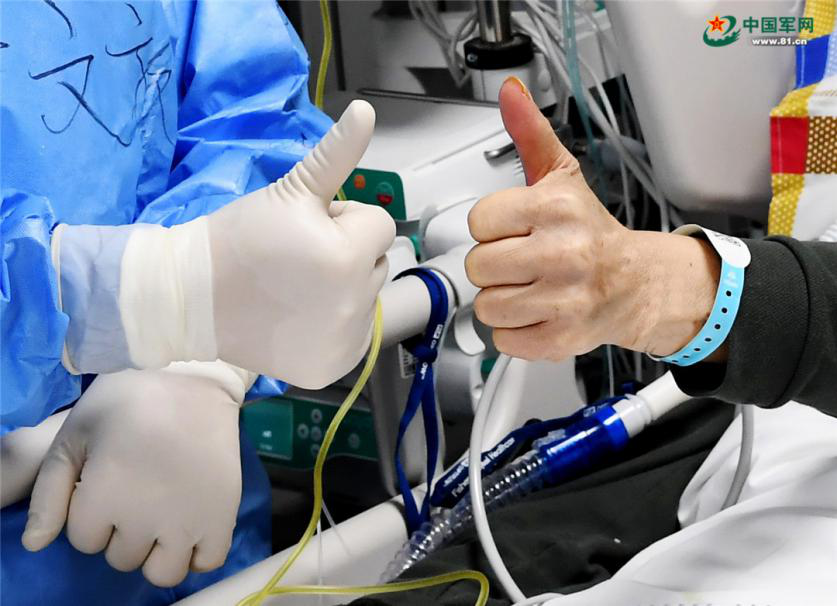 火神山醫院重癥醫學一科自2月10日開始收治重癥患者以來,全科醫護人員不畏風險全力救治,他們根據患者病情的變化,有預見性地快速調整救治方案,采取呼吸支持、抗病毒、維護臟器功能、加強營養等方法,使重癥患者逐漸有了好轉,提高了救治成功率?;ハ喙膭铧c贊,是在重癥室看到最多的場景。解放軍報記者王傳順 攝