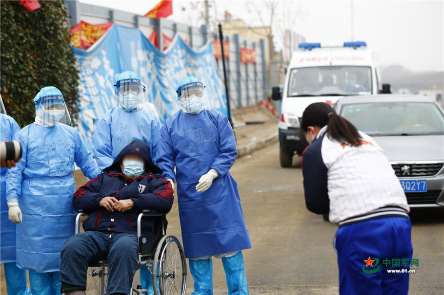 2月27日中午時分,從火神山醫院傳出好消息,經過醫護人員20多天的科學救治和精心護理,又有76名新冠肺炎確診患者康復走出火神山醫院,是目前該院單日出院人數最多的一天。圖為患者家屬向醫護人員致敬。王皓宇 攝