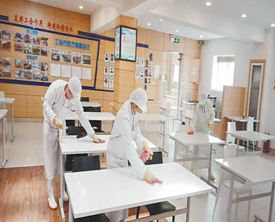 樂星汽車電子(青島)有限公司人員在對餐廳進行嚴格消毒。王 洪攝