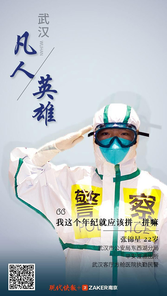 凌晨 2 點,結束了 6 小時夜班執勤的張錦星走出方艙。每天工作 10 小時以上,吃住全在派出所 …… 剛過完 22 歲生日的張錦星,自武漢封城的那天起一直奮戰在防疫一線。2 月 6 日,接到方艙醫院投入使用的通知后,張錦星主動請戰,進駐方艙核心區執勤。" 我這個年紀就應該拼一拼嘛!"