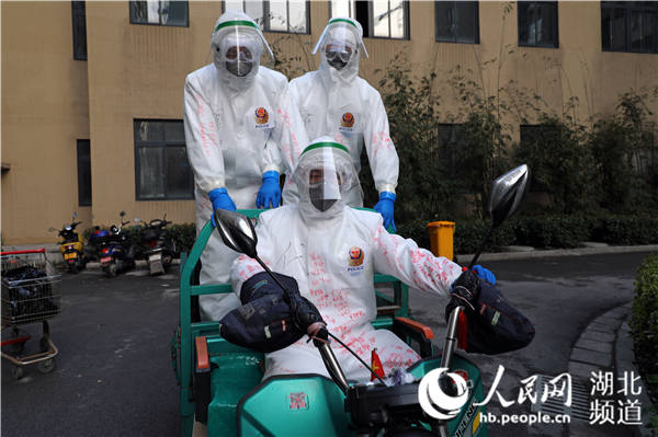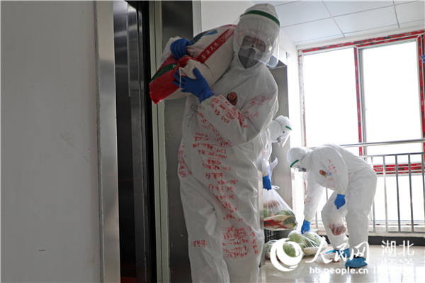 為滿足居民日常生活所需,代睿和隊員們騎著三輪車,按照物資清單和防護服上的記錄,一樣一樣地采購,平均每天要運送100余份物資,訂購的大米、各類水果,一趟趟跑、一袋袋扛。密不透風的防護服內,早已渾身濕透,汗從防護服的袖子直往外流。