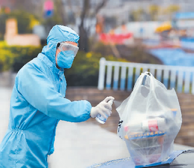 重慶部分火鍋企業在重慶市商務委和相關部門的指導下,為消費者提供零接觸火鍋外賣服務。圖為重慶一家火鍋店的配送人員在消費者來取外賣之前對包裝袋進行消毒。新華社記者 王全超攝