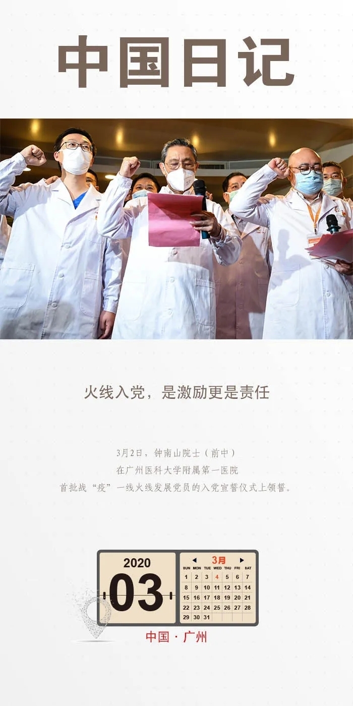 3月2日下午,一場特殊的入黨宣誓儀式在廣州和武漢兩地舉行。廣州醫科大學附屬第一醫院與廣東省馳援武漢醫療隊通過遠程視頻連線,舉行首批戰“疫”一線火線發展黨員入黨宣誓儀式,鐘南山院士領誓。