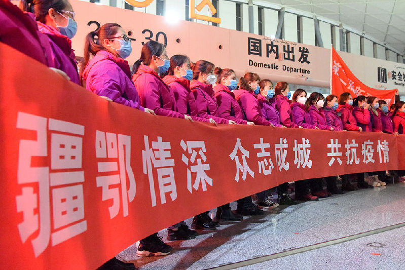 新疆第二批支援湖北醫療隊隊員在出征儀式上(2020年2月4日攝)。記者 丁磊 攝