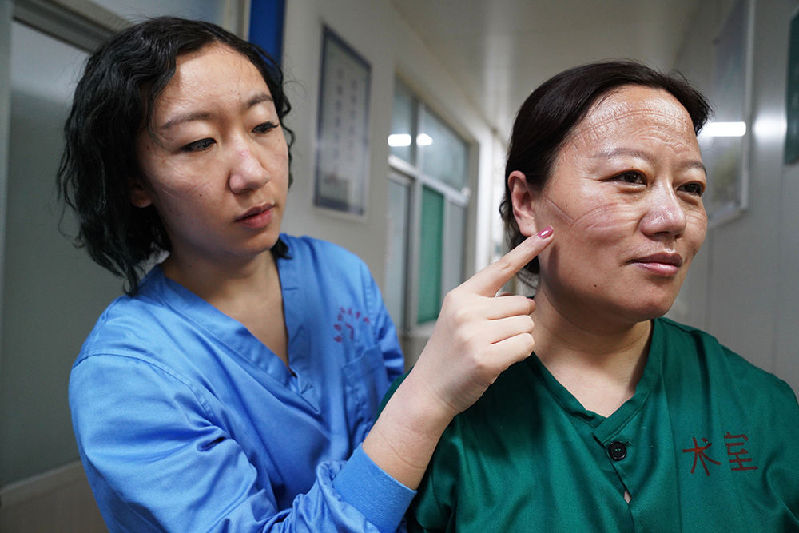 2020年1月28日,在山東省鄒平市人民醫院,醫護人員彭美麗(右)和鞏曉君把防護服脫掉后,臉上留下很深的勒痕。新華社發(董乃德攝)