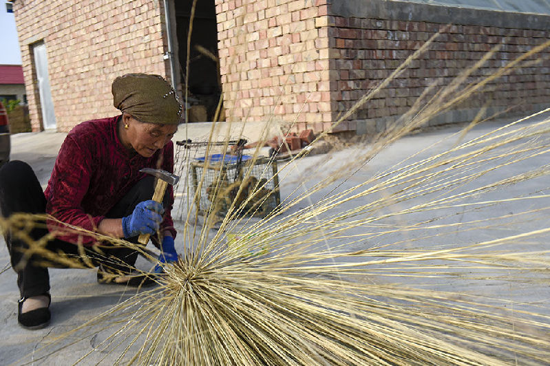 李耀梅在加固掃帚(2019年4月28日攝)。新華社發(馮開華 攝)