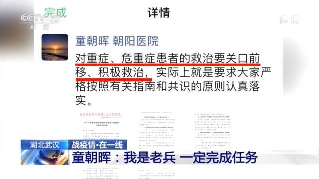 中央指導組專家組成員、北京朝陽醫院副院長 童朝暉:從策略上要轉變,那就是要積極救治,就是關口前移,通俗一點就是往前趕。那么怎么關口前移?我們就提出來了標準,有一些可操作的參數。
