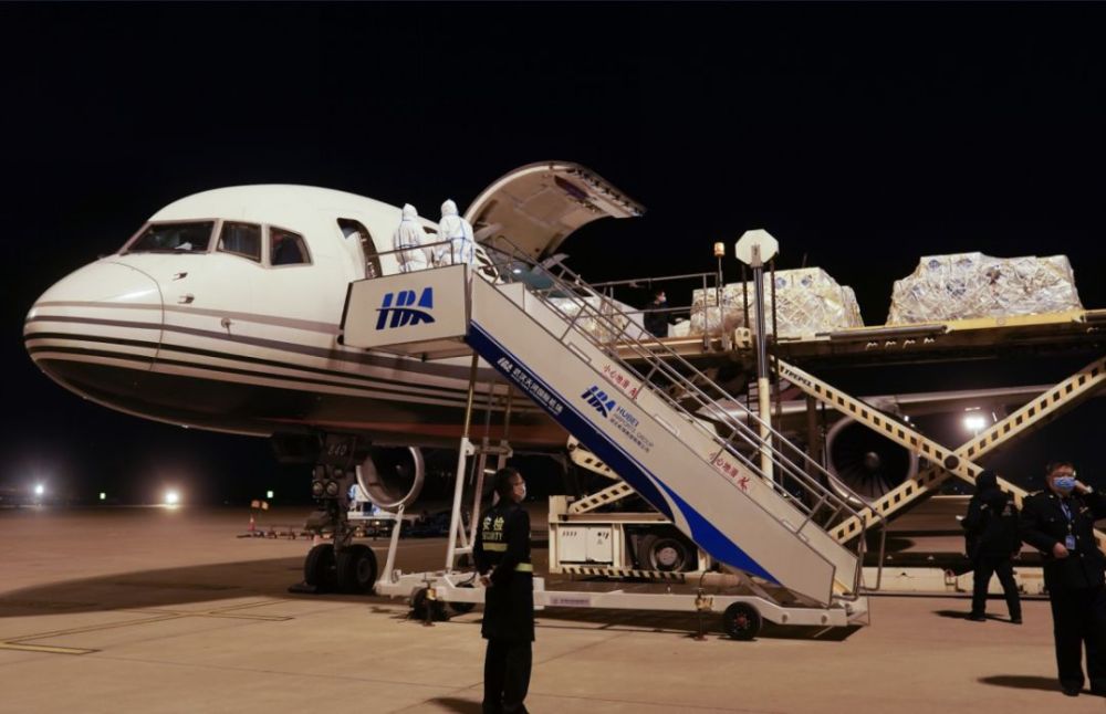 工作人員在武漢天河機場搬運醫療物資(新華社記者 程敏 攝)